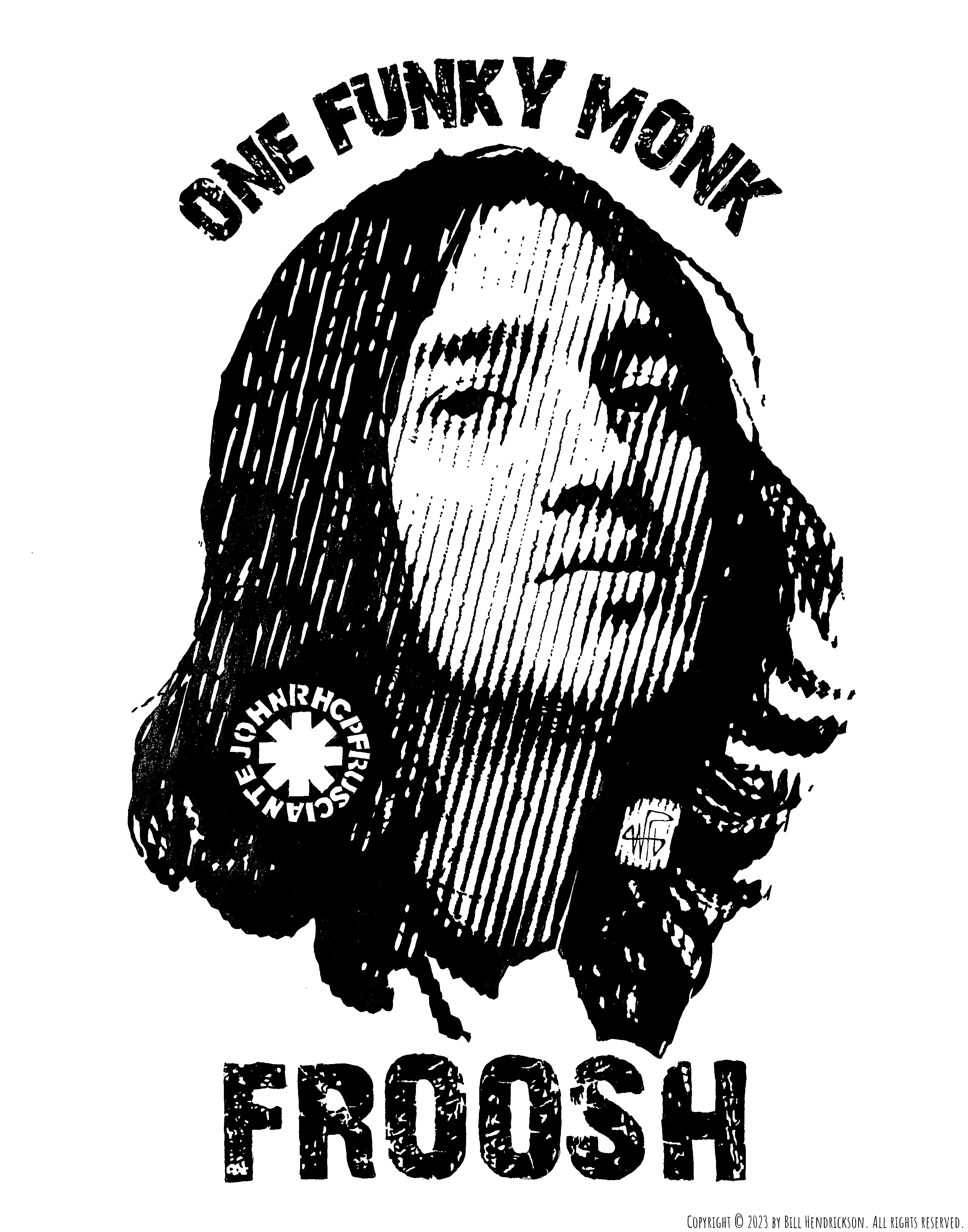| FROOSH, One Funky Monk A Happy Birthday ink drawing for Red Hot Chili Peppers guitarist John Frussciante. This is a based loosely on my pencil slashy style, simplified so I could knock it out quickly. |