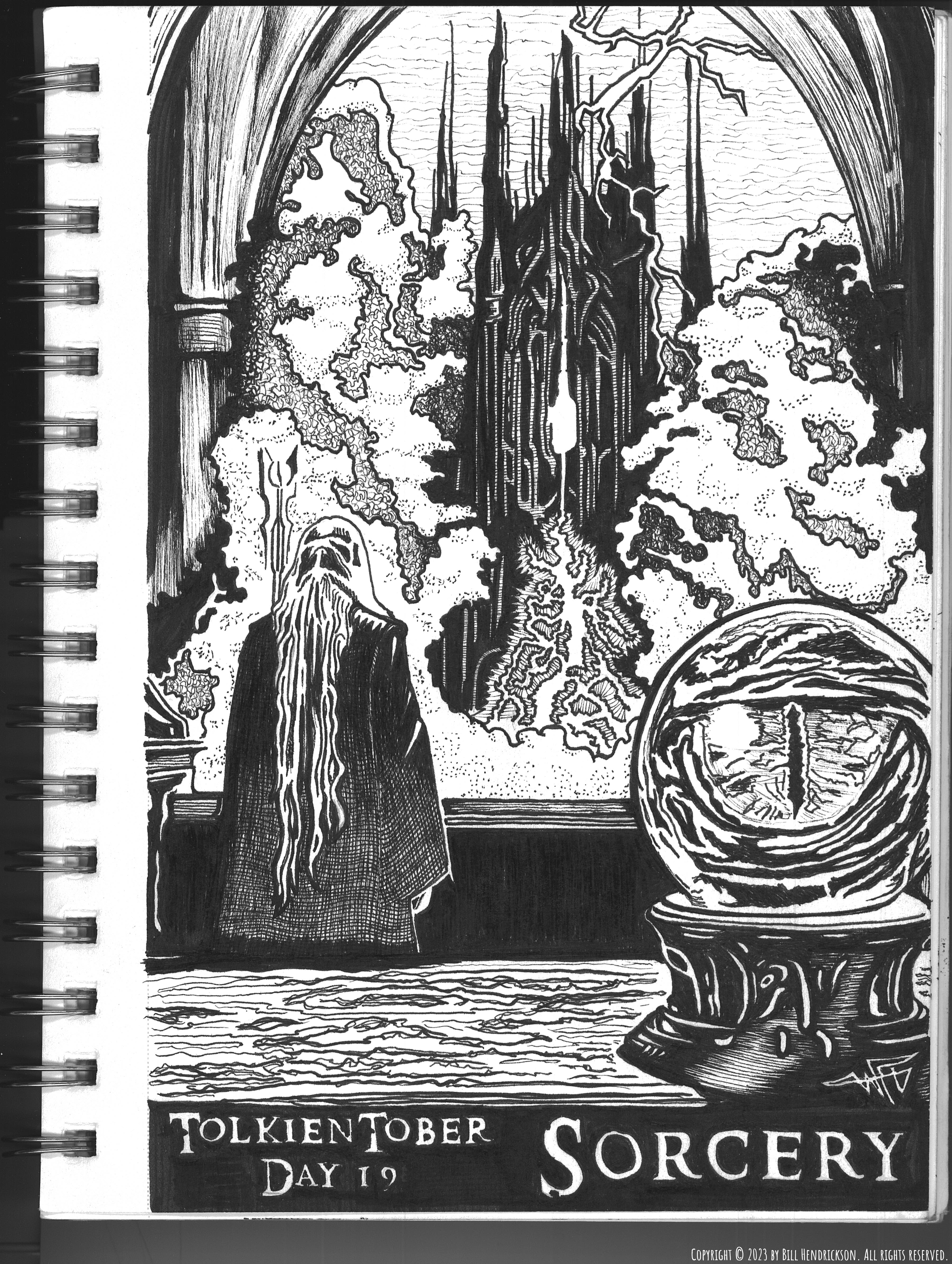 | Sorcery, for Tolkientober Shortly after discovering Inktober, I discovered Tolkientober (on Twitter). For the prompt SORCERY it was brought to my mind an image of Saruman standing in Orthanc, his tower of sorcery, surrounded by swirling mist, as he gazes out his window at Barad-dur in the distance. In the foreground rests a Palantir, dominated by the fire-ringed eye of Sauron. |