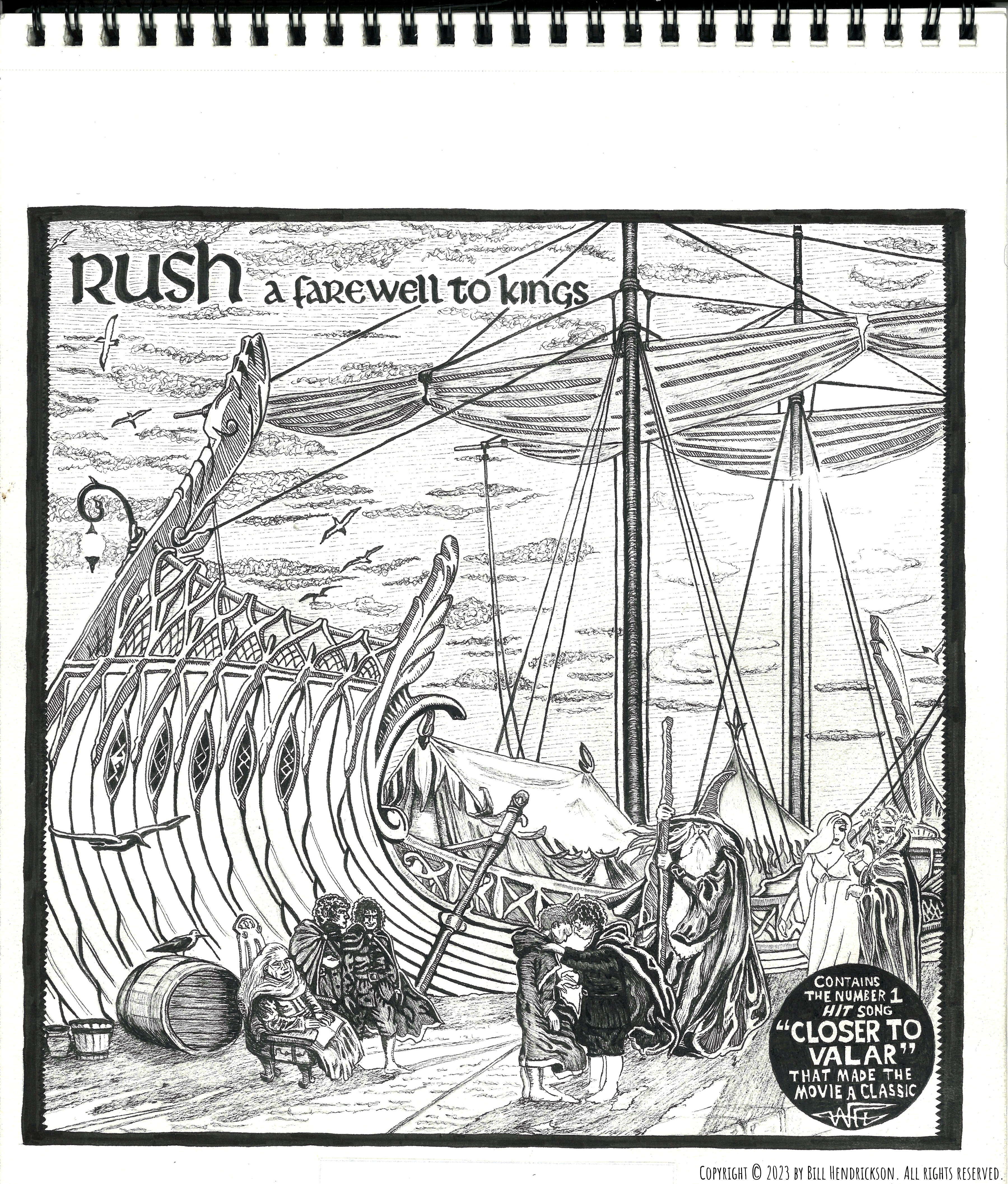 | Farewell at the Grey Havens, for Tolkientober The Tolkientober Day 30 prompt was FAREWELLS, and Inktober Day 30 was RUSH. I wanted to combine the two...enter the classic album by Rush. Based on a famous image by Ted Nasmith, I used inspiration for other characters in the scene created by other famous artists (Party Mix). |