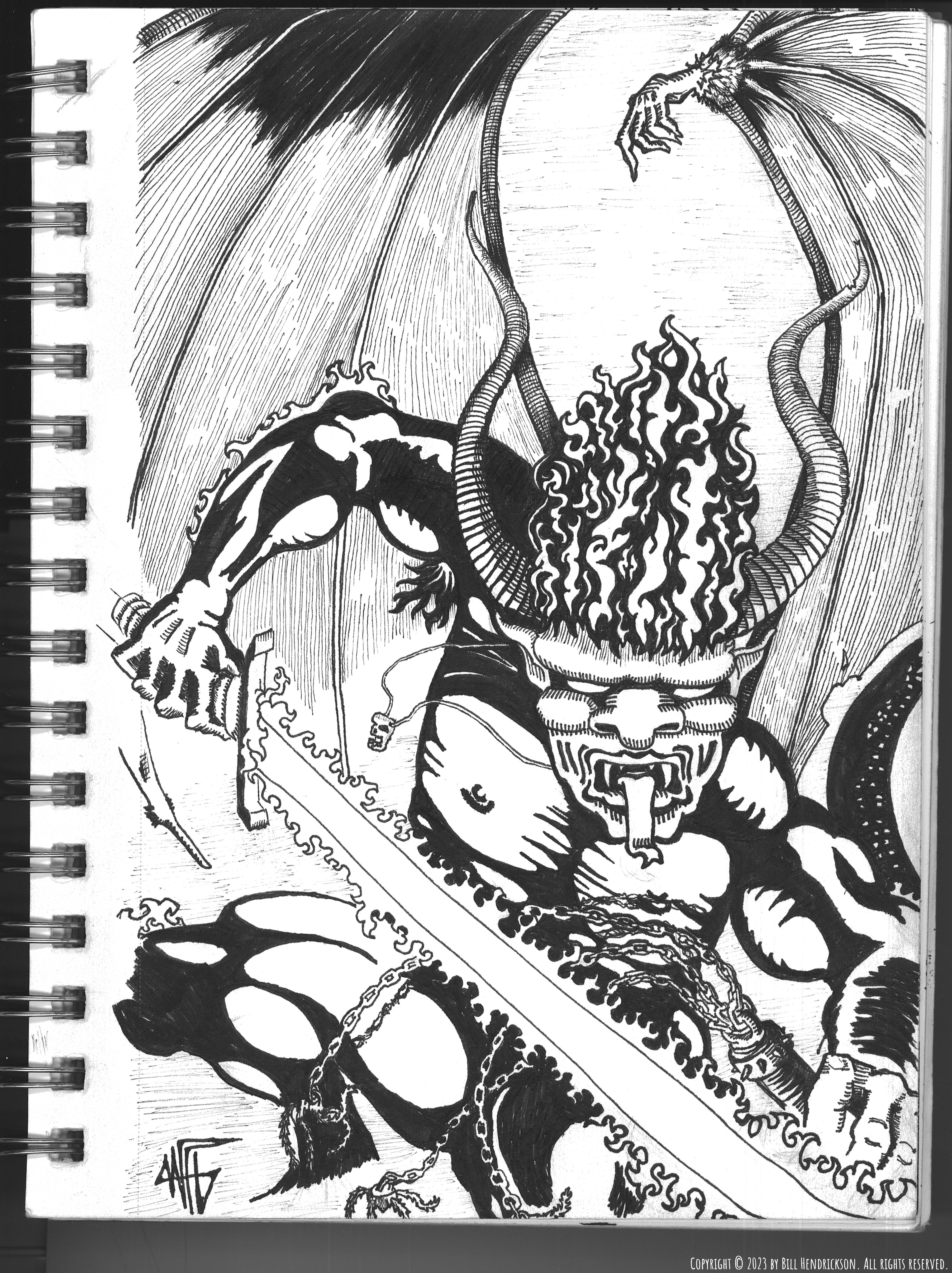 | Demon, for Inktober I try to draw every day. Impossible! This is a Demon I drew for Inktober 2023, Day 17. Technically, he is a "Type VI" demon, if you must know, and he might go by the name of "Balor". |